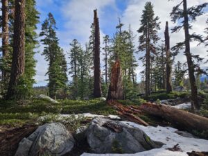 Donc ce matin comme ils n’ont pas beaucoup de miles à faire, ils se sont accordés une grasse matinée, départ à 6h… pas vraiment une grasse matinée chez nous. Depuis leur camp dans la montagne ils voient le lac Tahoe et surtout le soleil qui arrive !